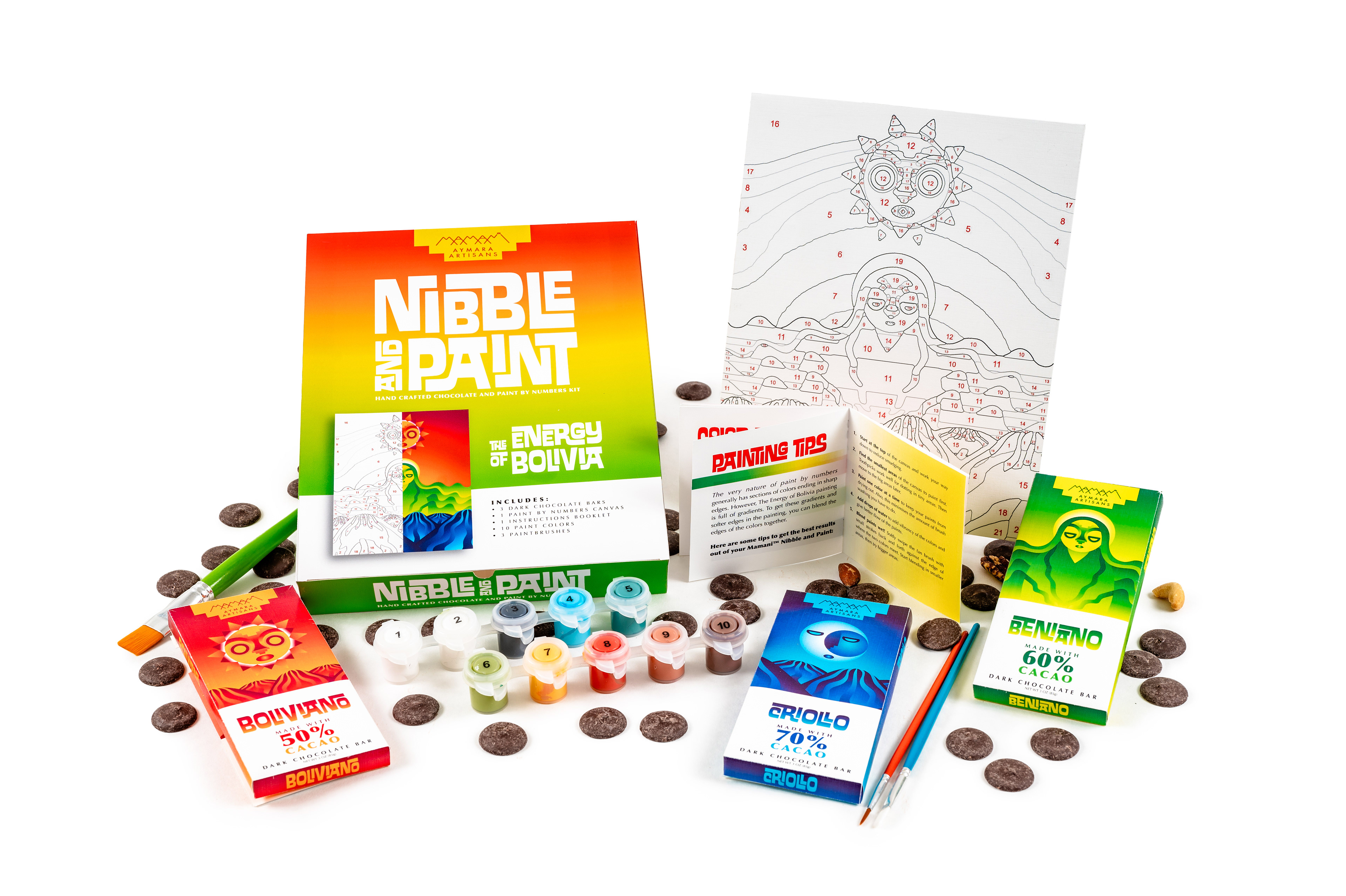 After designing and building physical packaging prototypes, I expanded this chocolate project into a paint-by-numbers set to form the Nibble and Paint Kit, as a way to embrace Roberto Mamani Mamani’s skill.