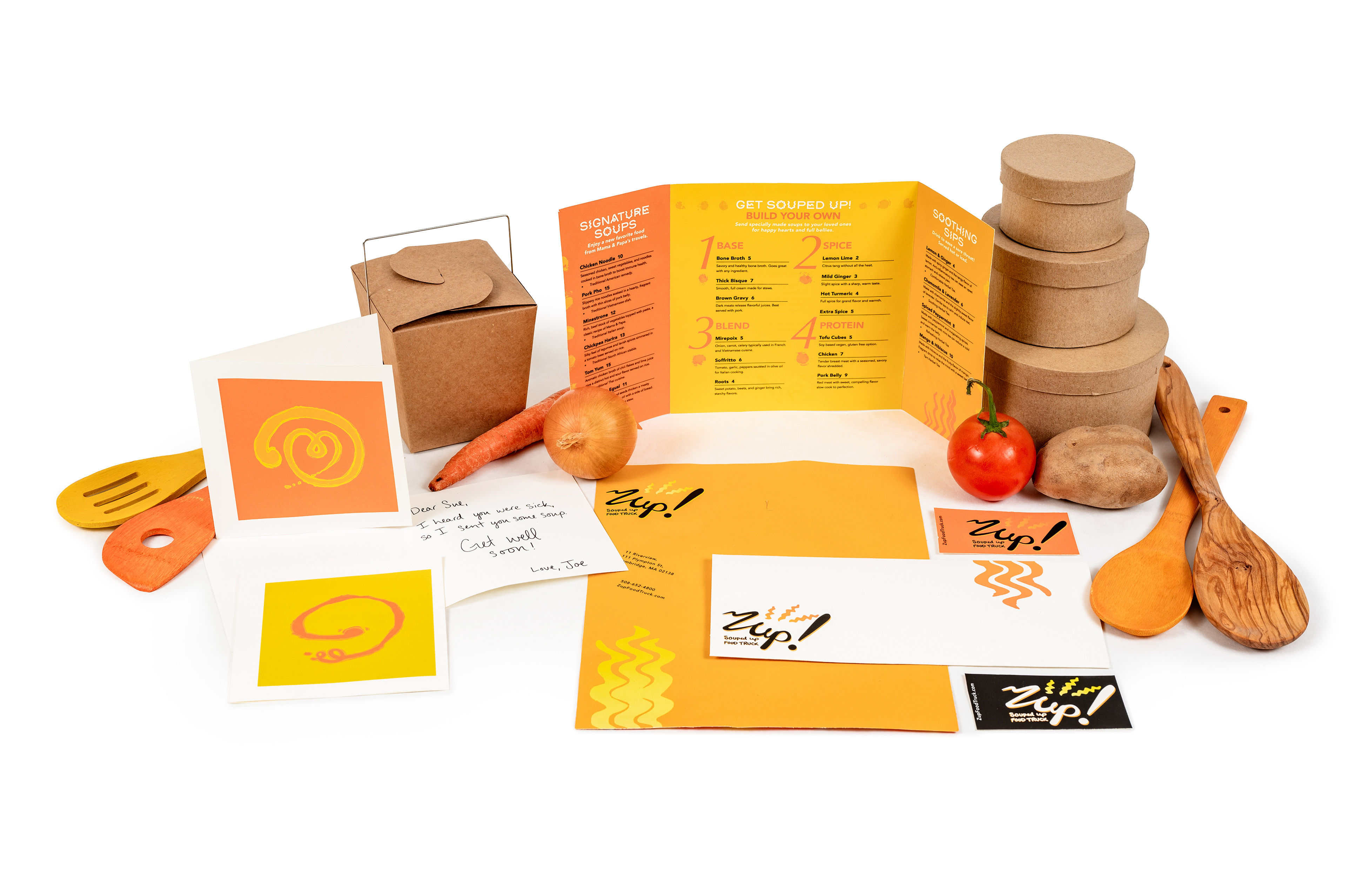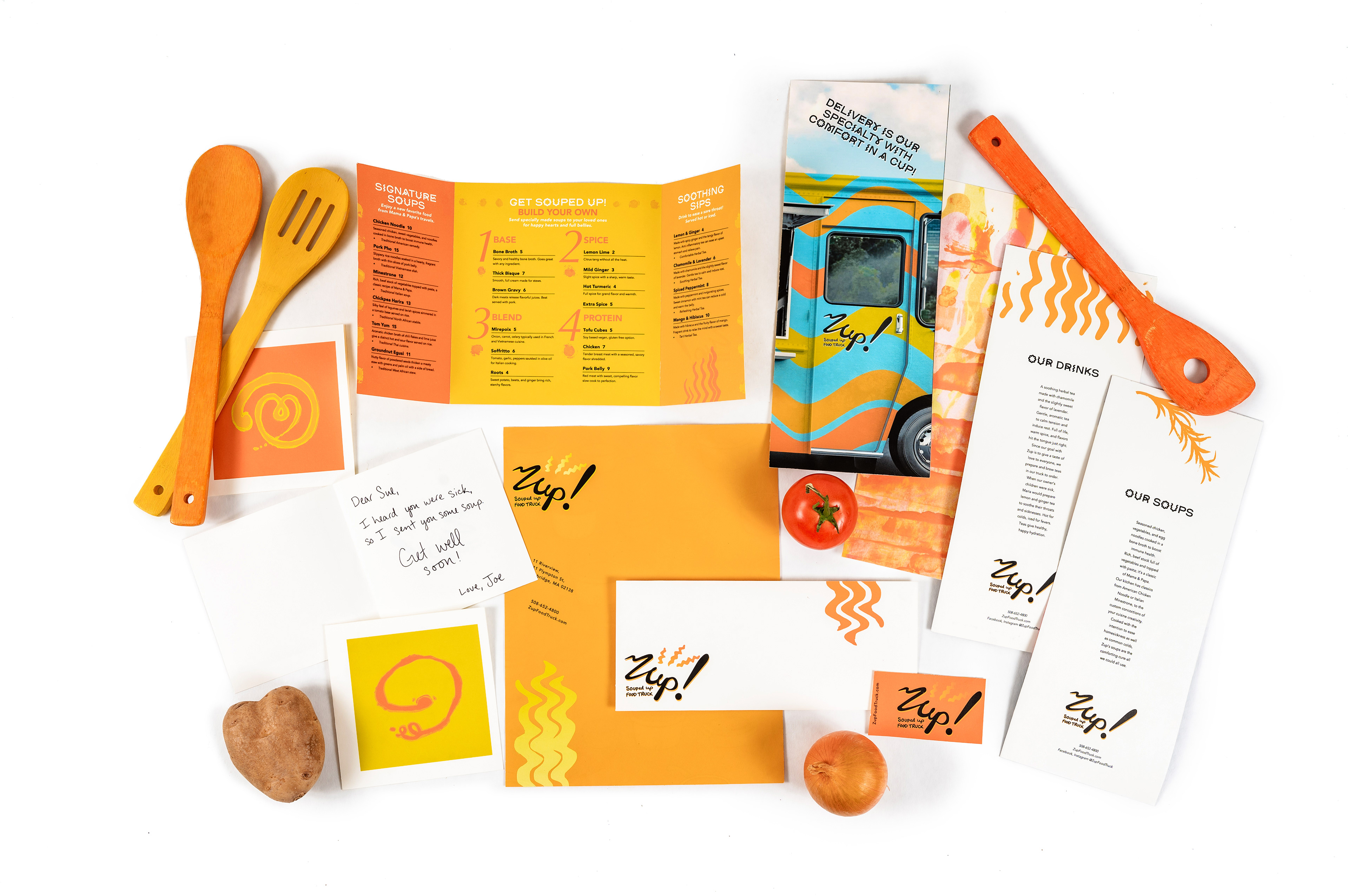 Imagine a loved one is feeling under the weather, and you want to make their life a little easier; what better way to bring a smile to their face than with a steaming hot bowl of soup made to their personal taste? Zup! is a made-to-order soup kitchen focused on delivering a comforting, handmade experience to people seeking a nature boost to their immune system. From the warm, bright color palette to quick and friendly typography, this brand was made with taste in mind. Physically illustrated images of bowls, broths, and toppings show visually the amount of care put into your food.